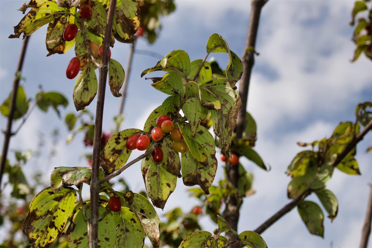 台風21号の影響なのか葉っぱがシミだらけのサンシュユの木です。