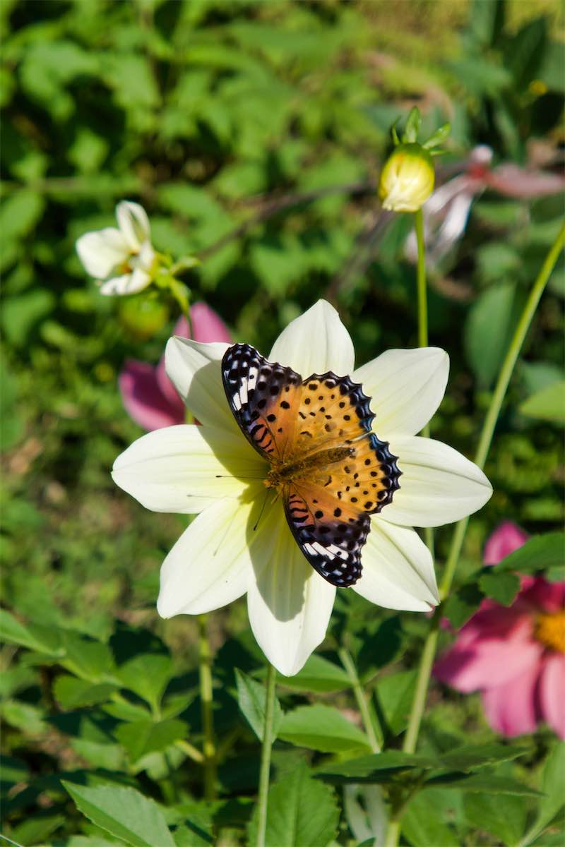 ダリアの花に蝶が止まっています。と言いたいところですが、蝶なのか蛾なのかわかりません。